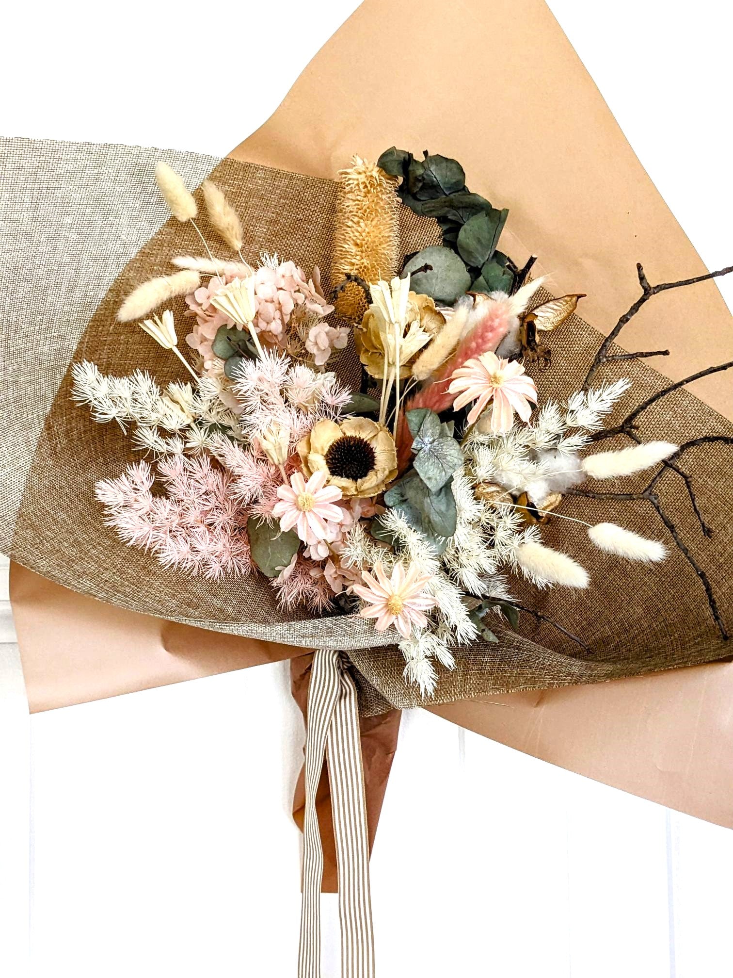 Flossy is a sweet combination of soft pastel pinks and whites with a background of neutrals and soft blue/grey gum foliage. Featuring hydrangea, bunny tails and fluffy Ming fern. This bouquet is a perfect for styling a bedroom or a new baby arrival gift.