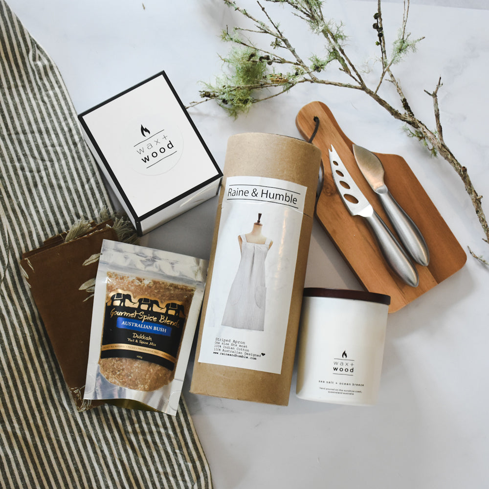 Raine & Humble Linen Apron, Linen tea towel, Wax and Wood scented candle, timber mini cheese board and knife set and a Gourmet dried herb selection.