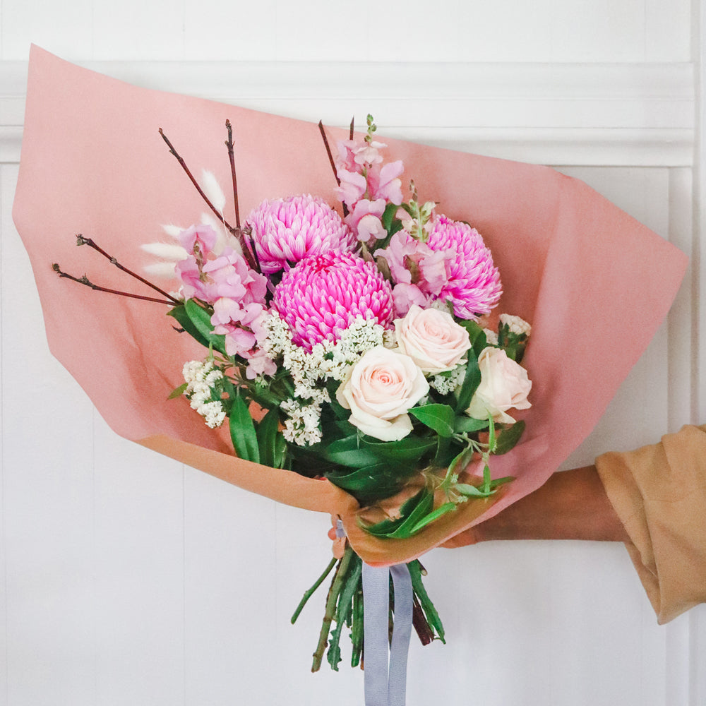 A feminine selection of premium blooms including lush disbuds and stunning roses, presented in a modern style hand tied bouquet.