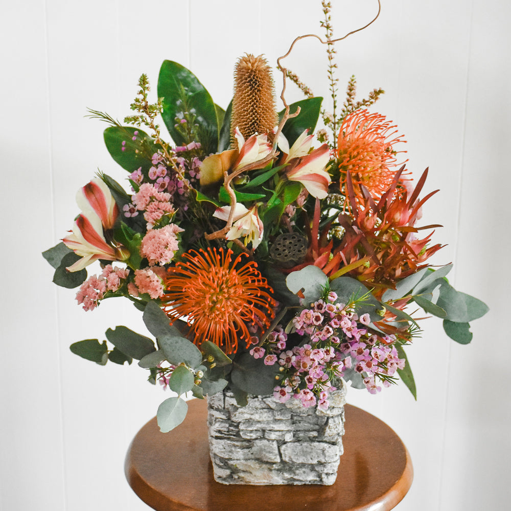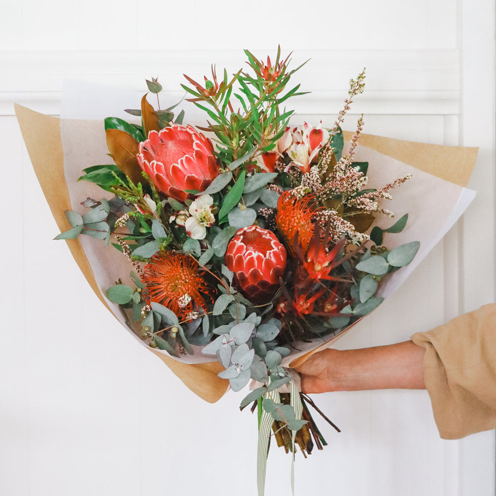 A hand-tied bouquet featuring a mix of native blooms, wildflowers, and eucalyptus—bringing the beauty of the Aussie bush. With its long-lasting charm, this bouquet is a perfect gift for nature lovers