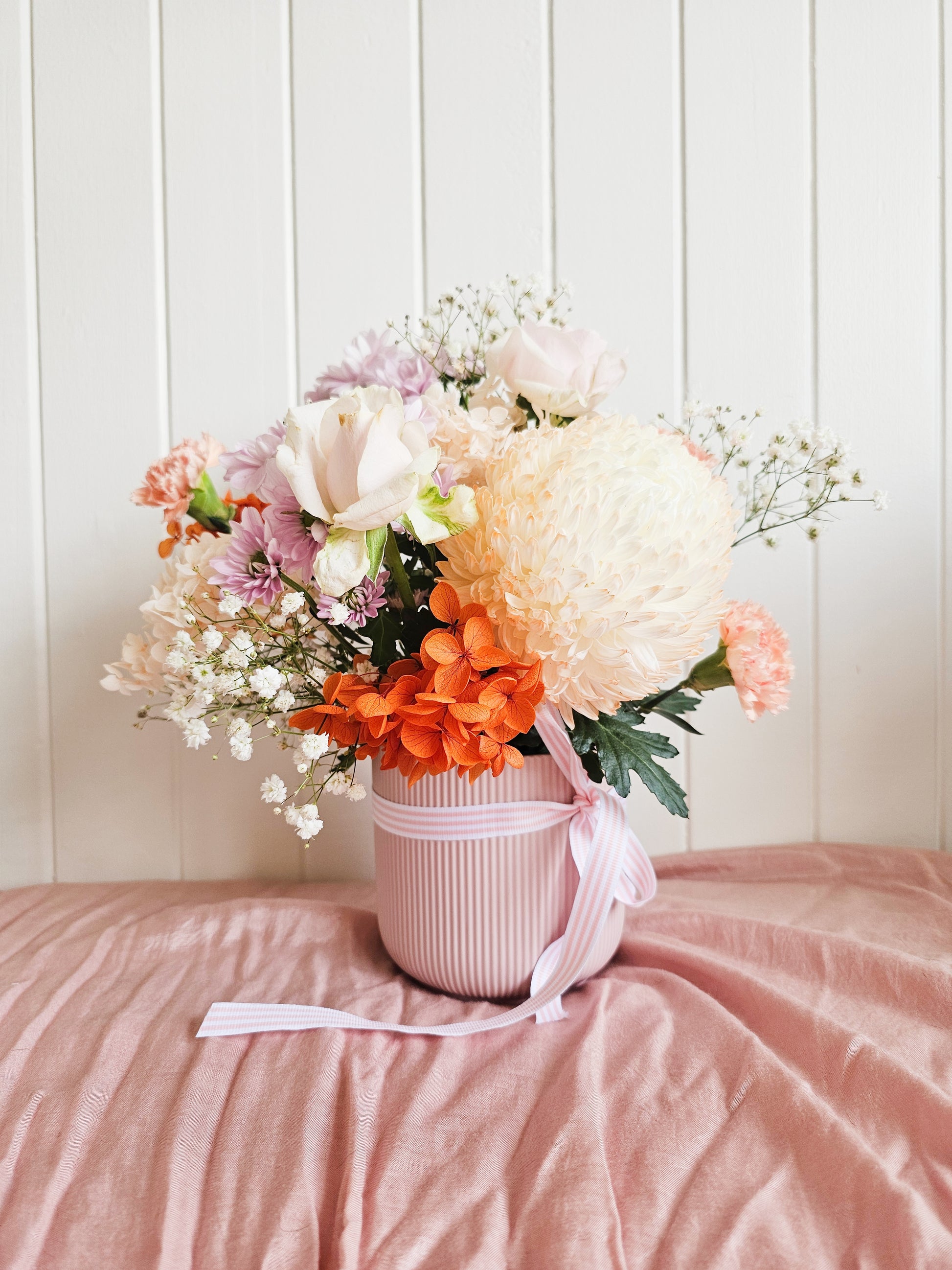 Our Peachy Queen is a whimsical mix of beautiful soft pink , blush and peach tones with layers of full, lush roses, lisianthus and fluffy disbuds. This arrangement comes in a matte pink ceramic pot.
