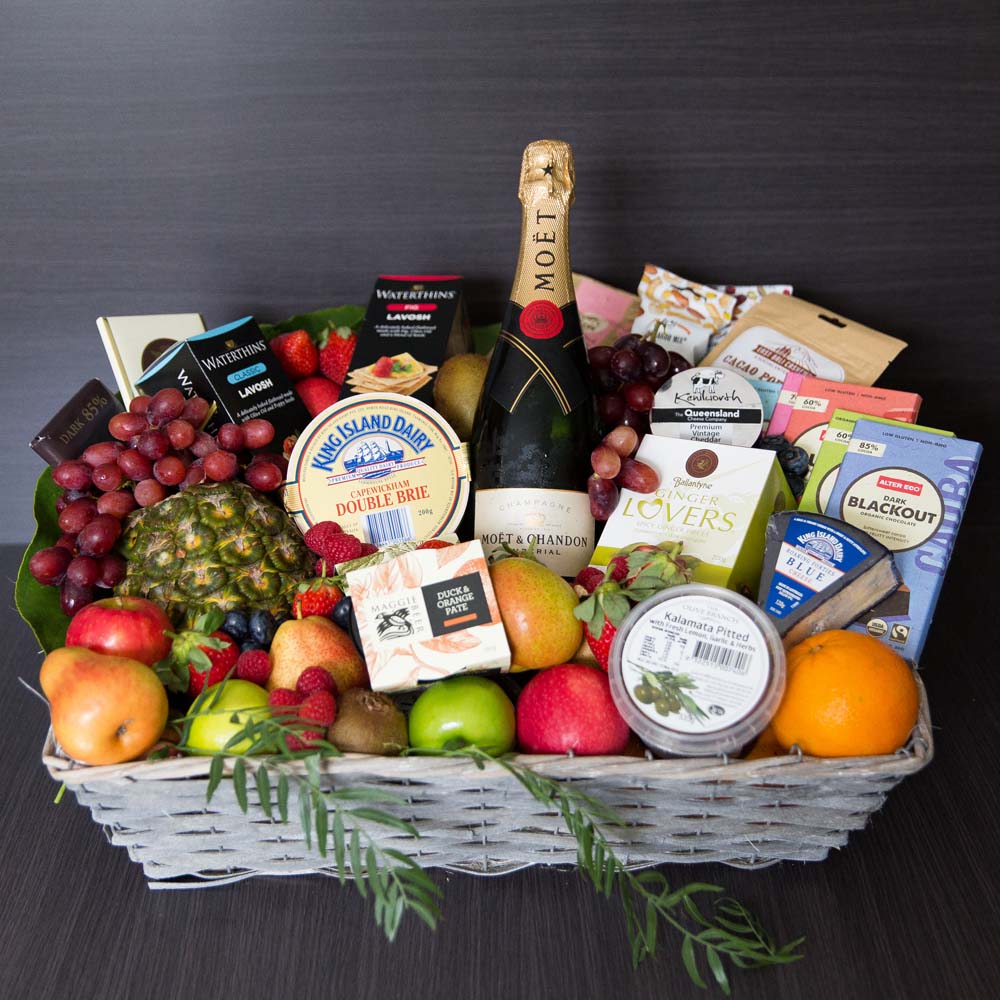 A sumptuous mouth watering, extravagant selection of sweet and savoury delights, including cheeses, chocolate, olives, gourmet crackers, pate, seasonal fruit and berries complimented with a bottle of Moet champagne.