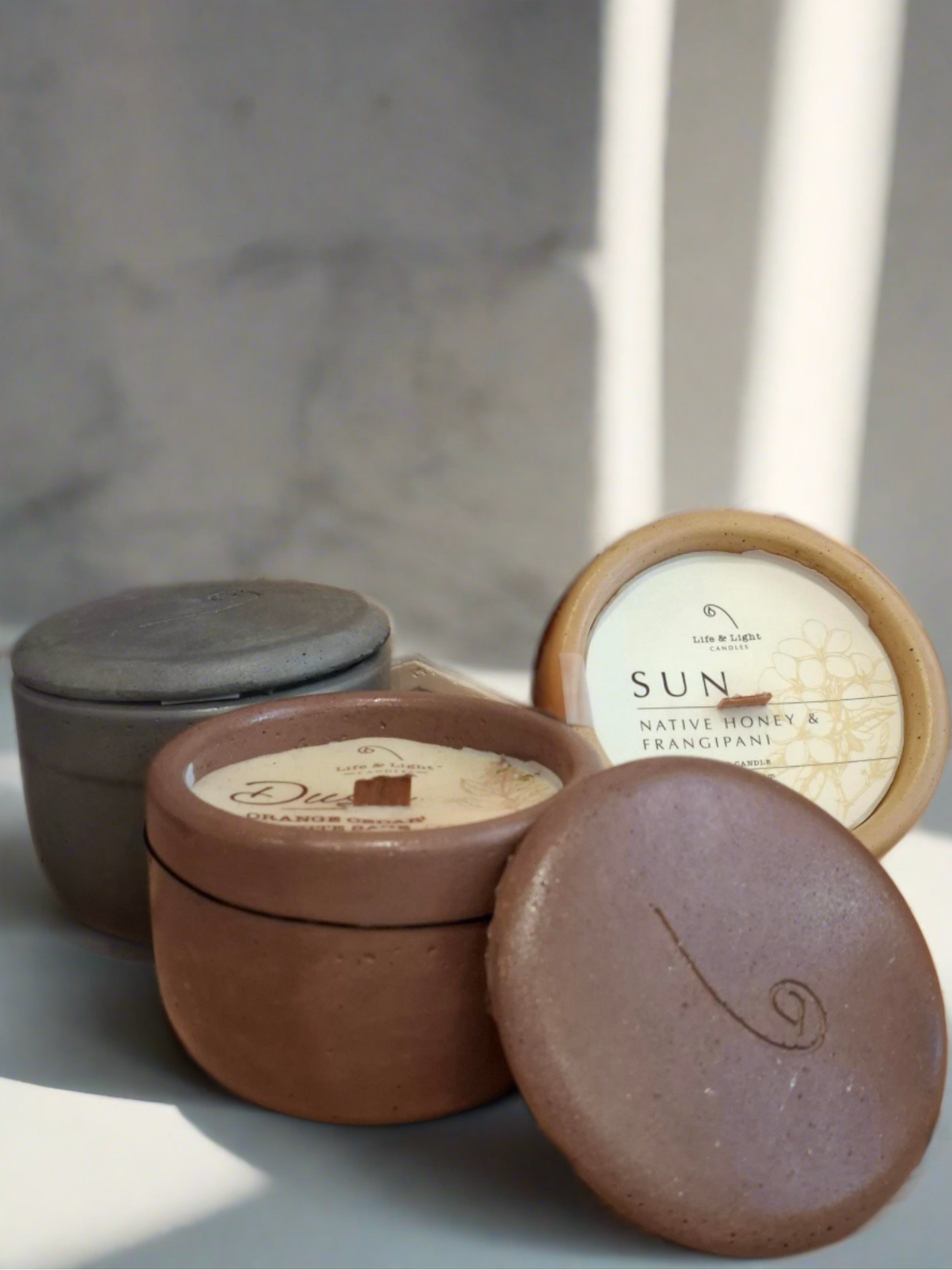 Our beautiful scented candles are from Life and Light, made locally on the Sunshine Coast. They are hand poured, using high quality 100% Australian blended soy wax with a crackling wood wick . The gorgeous concrete pots are individually handmade and every scent is divine. Approx burn time 50 hours.