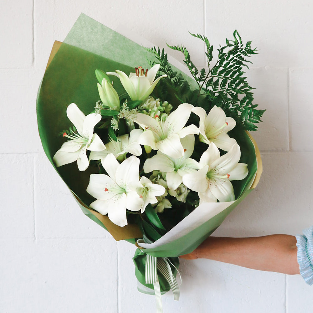 A stylish presentation of elegant simplicity. Fragrant Oriental lilies with lush foliage. Choose either from pink or white.