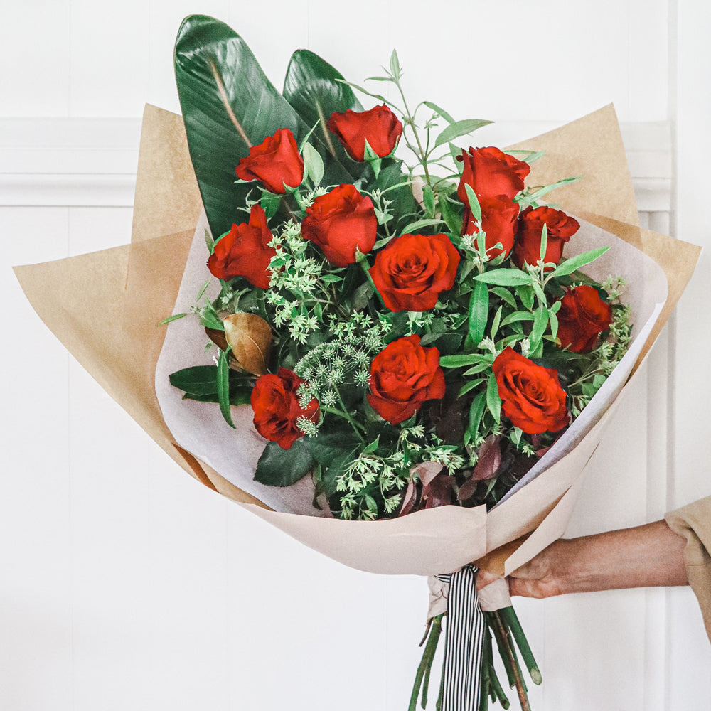 A classic rose bouquet featuring 6 or 12 gorgeous rose blooms with lush foliage and beautiful embellishments. (please contact us if you require a different colour).