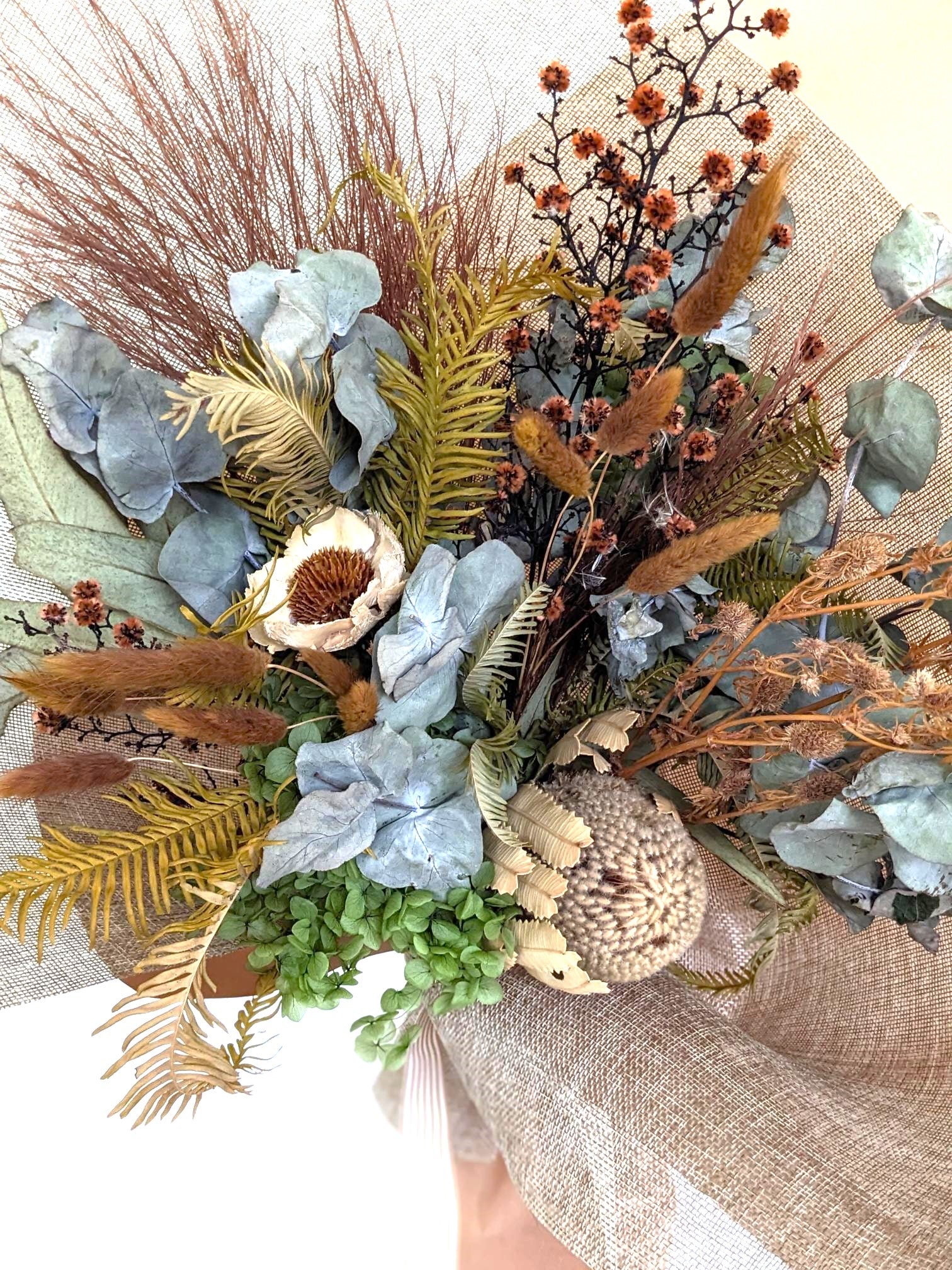 This bouquet is lush selection of blue/greys, greens, rust and caramel tones. Just like a walk in the forest. These darker, rustic colours would be suitable in styling a modern or country home and a beautiful gift for any occasion.